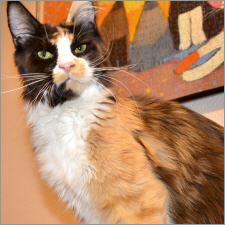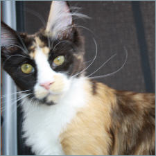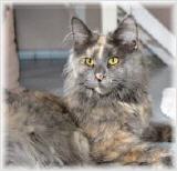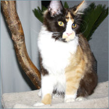 Sie hat die Farbe black tortie/white und ist ein sehr verspieltes, aufgewecktes und kuscheldürftiges Mädchen.