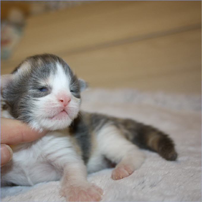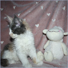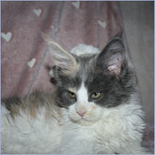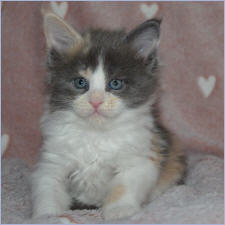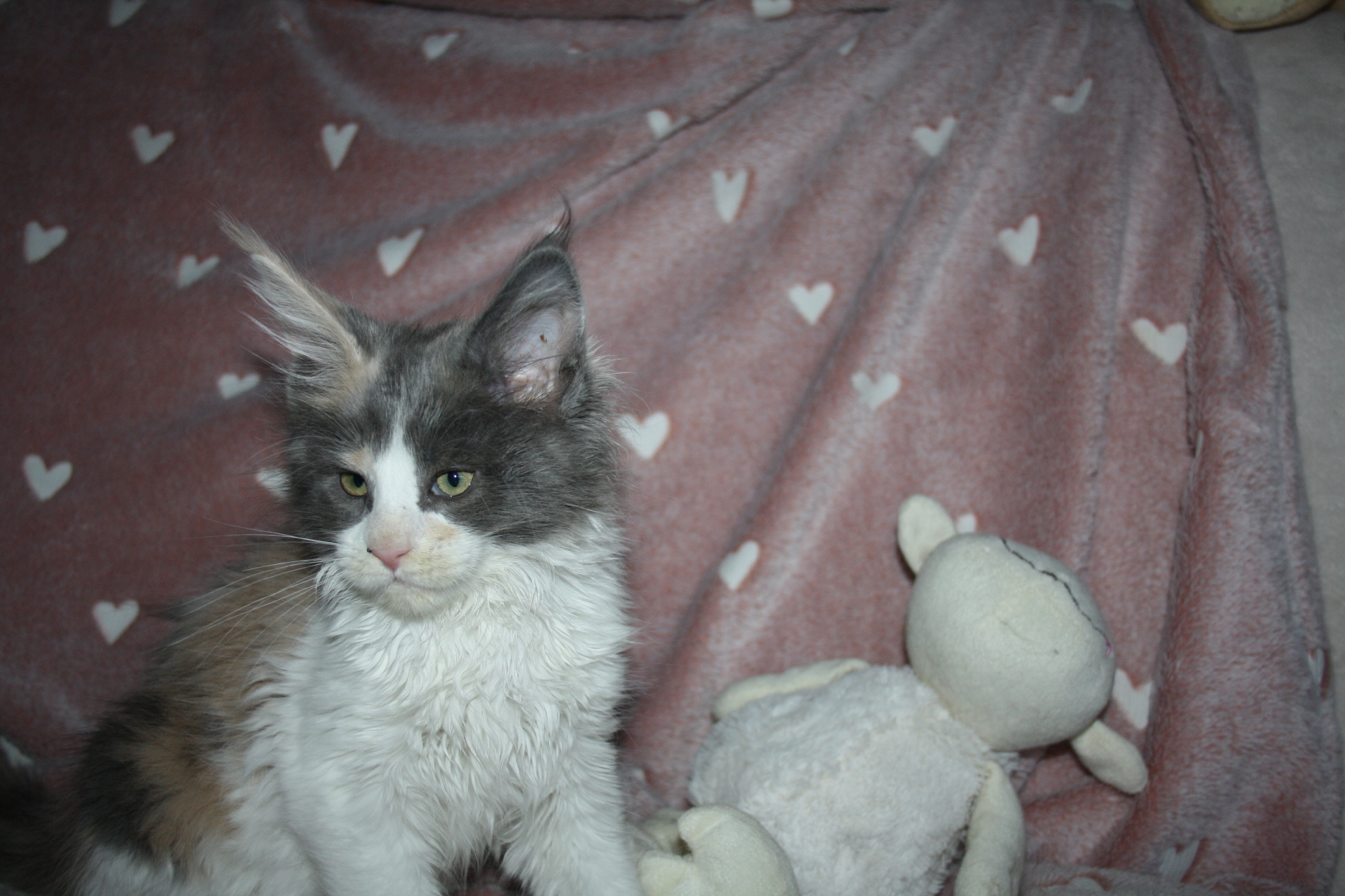 Belana ist ein Mädchen und hat die Farbe blue tortie/white und bleibt bei mir in der Zucht.